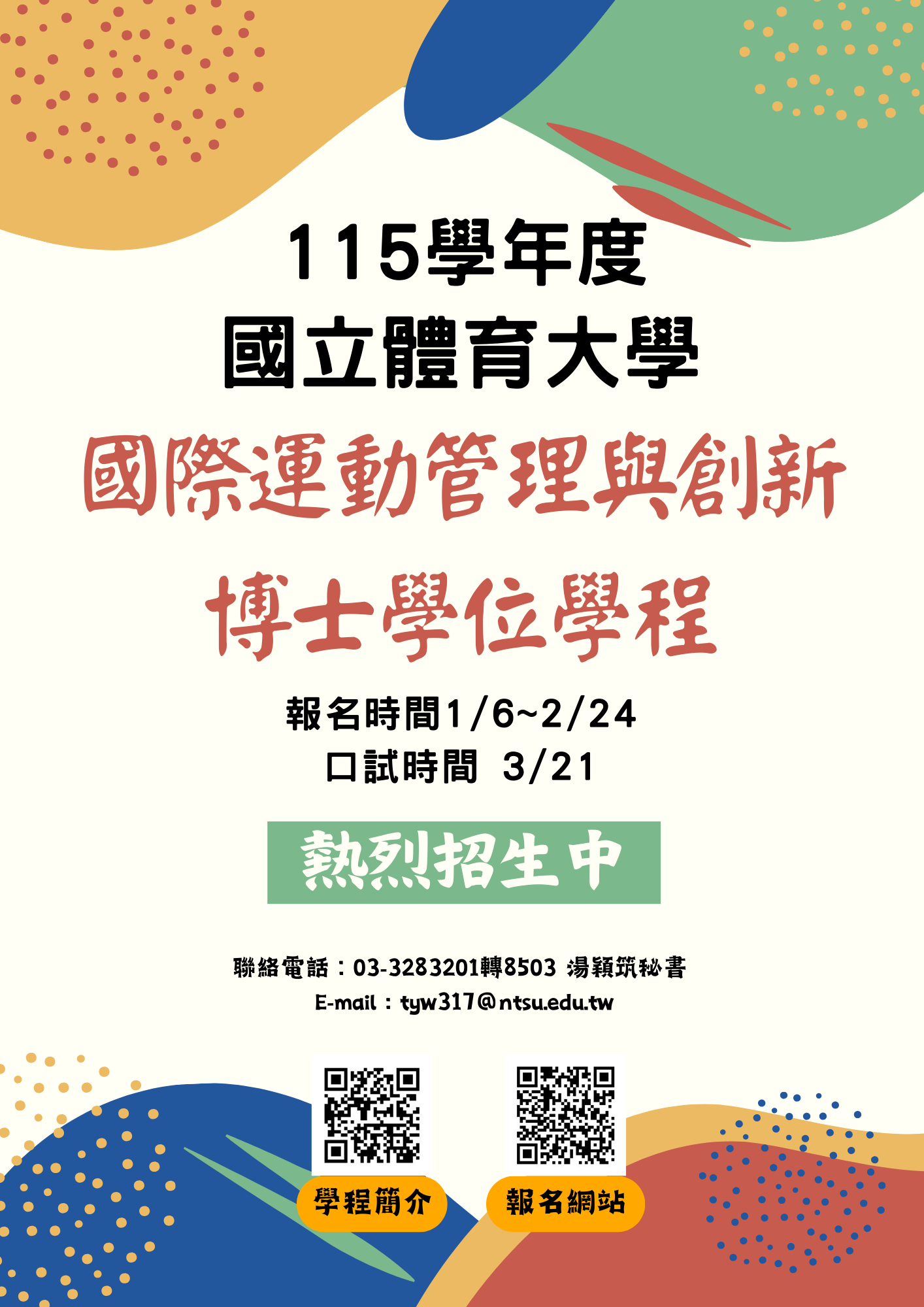 115學年國際運動管理與創新博士學位學程招生報名資訊: